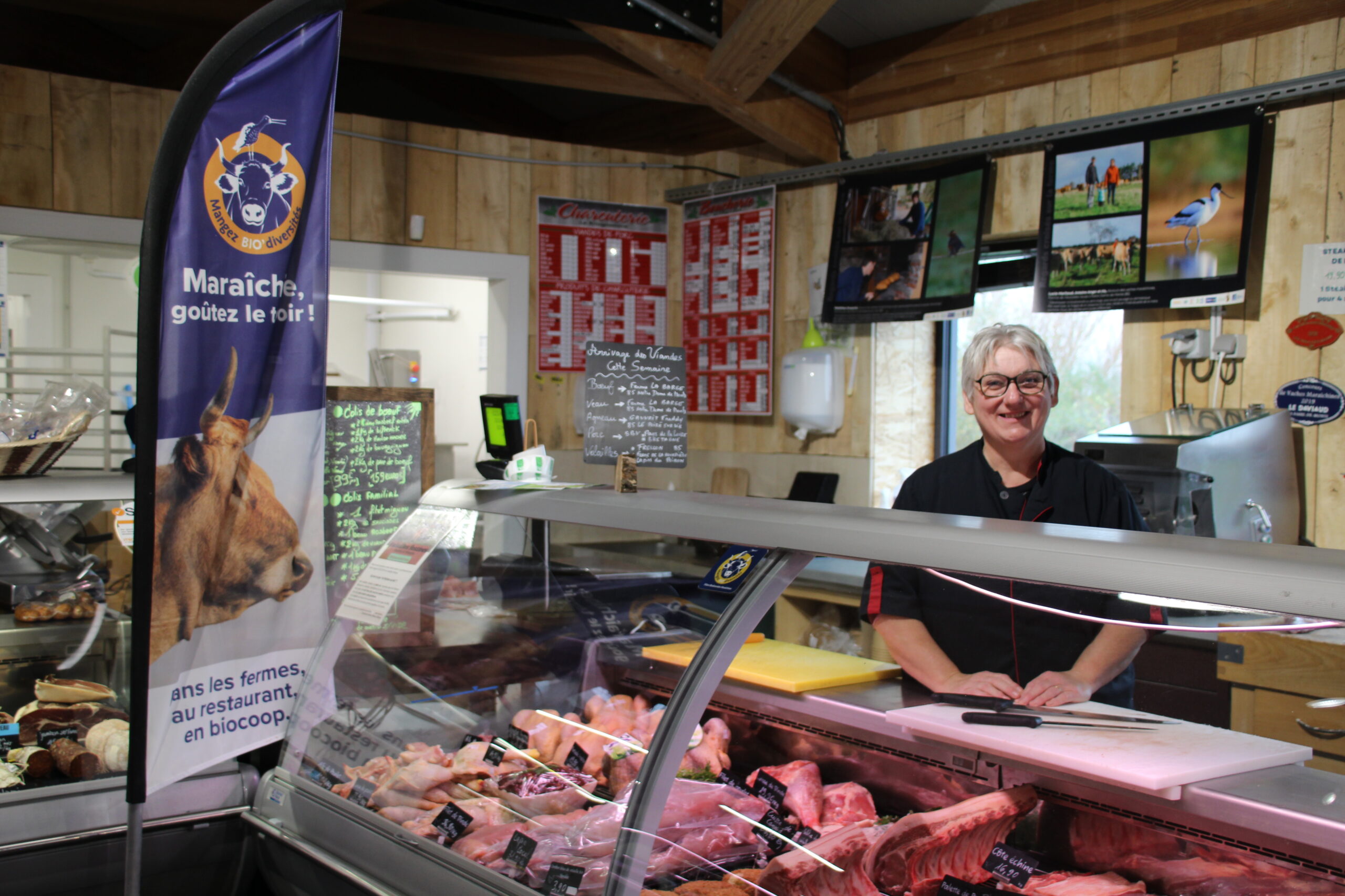 Originaire de Saint-Gilles-Croix-de-Vie, Fred change d’univers après quelques dizaines d’années de métier pour découvrir l’alimentation bio. Motivé par le projet porté par la filière Biodiversités Maraîchines, il est enthousiaste, notamment après sa rencontre avec une partie des éleveuses et éleveurs lors de la journée de formation « découpe et usage des morceaux » le 19 novembre. Des visites d’élevages sont prochainement prévues avec les bouchers des autres Biocoop partenaires de la filière. Fred travaillera en compagnie de Chantal, qui sert les clients du rayon boucherie depuis plusieurs années.