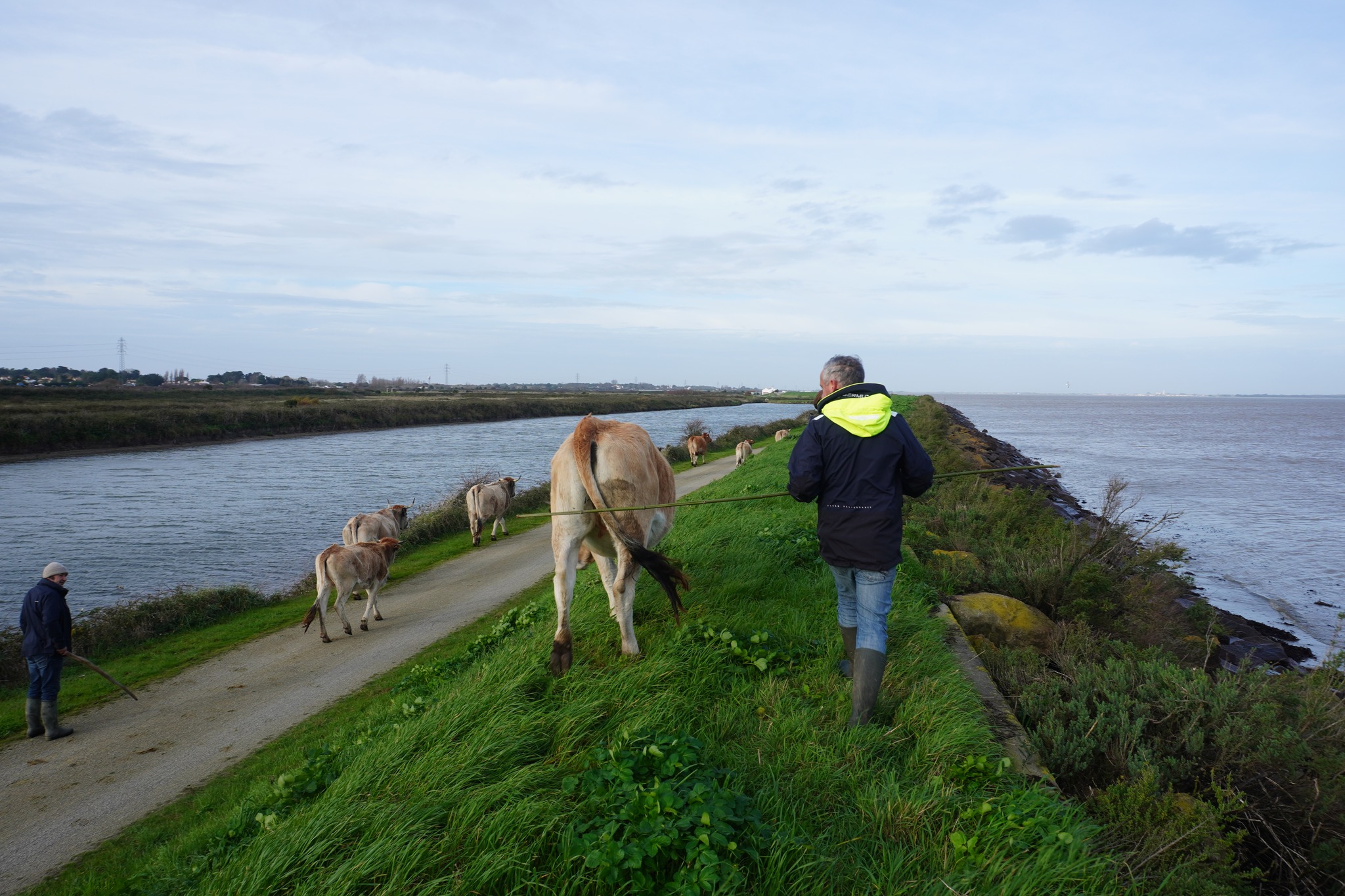 Exemple de la transhumance des vaches de Larissa et David vers une nouvelle prairie (le troupeau est en plein air intégral et pâture notamment dans la Réserve Naturelle Régionale du Polder de Sébastopol, gérée par la Communauté de Communes de l’île de Noirmoutier).